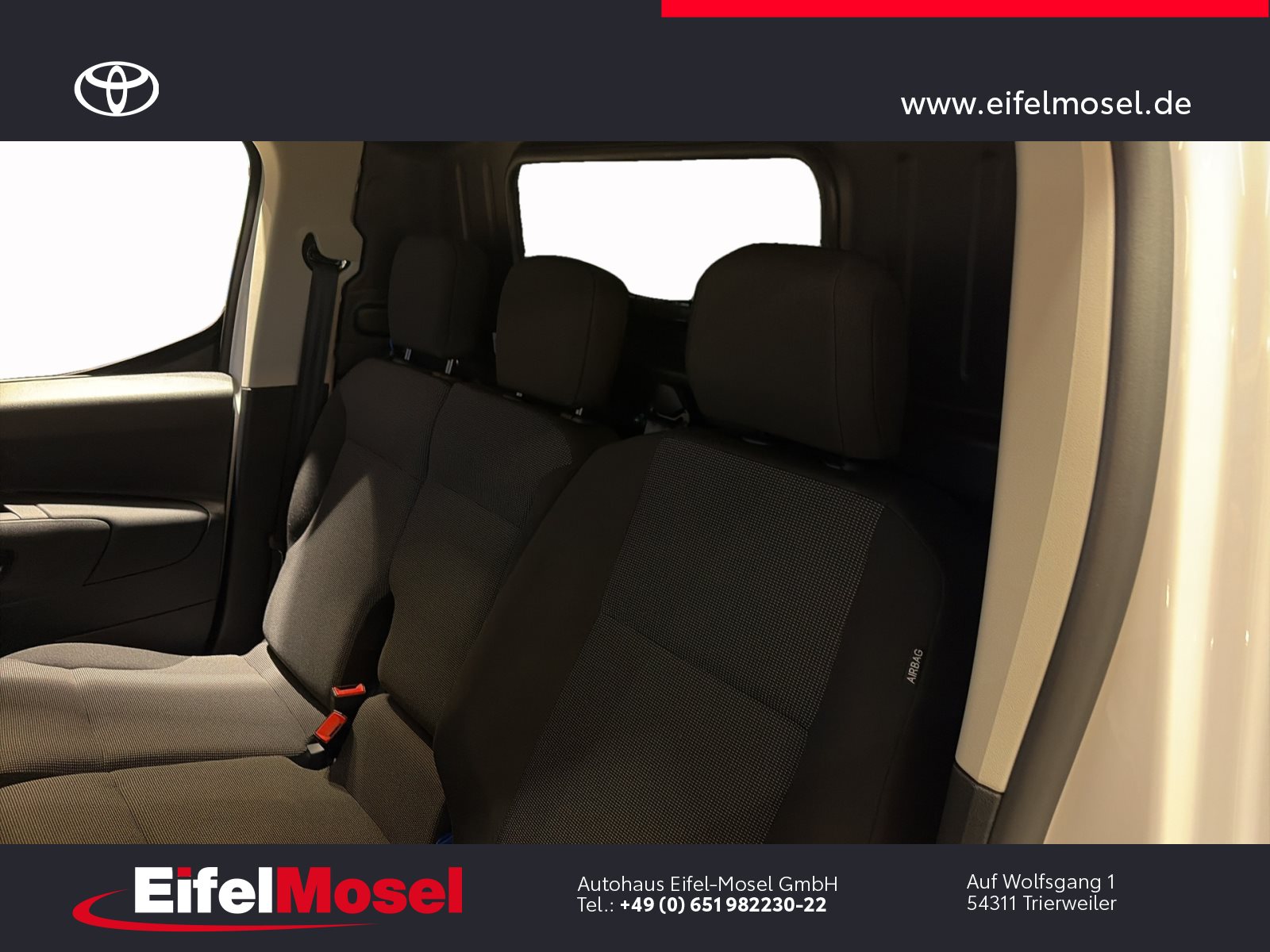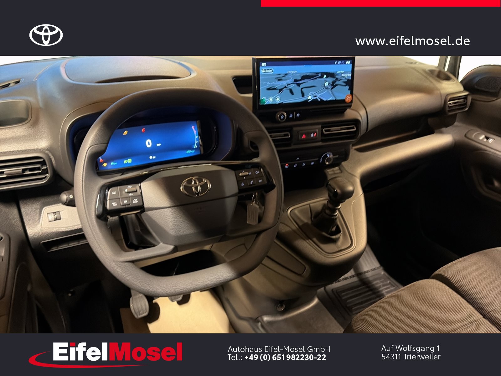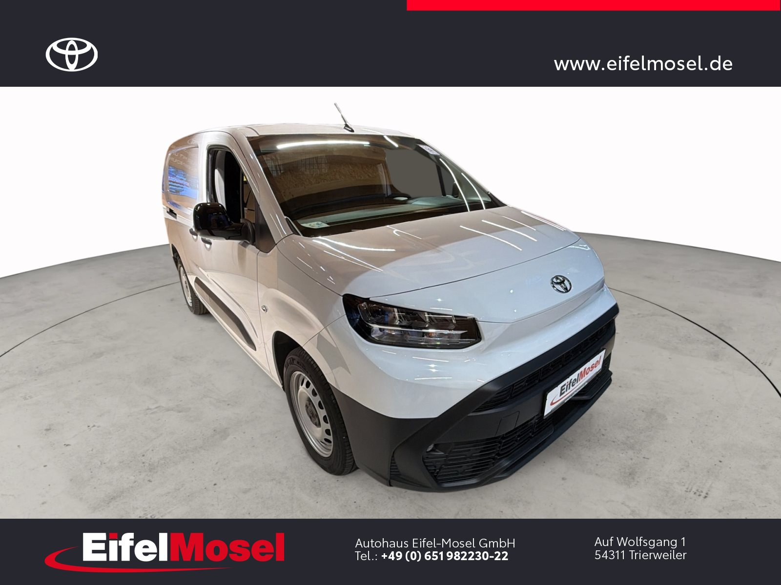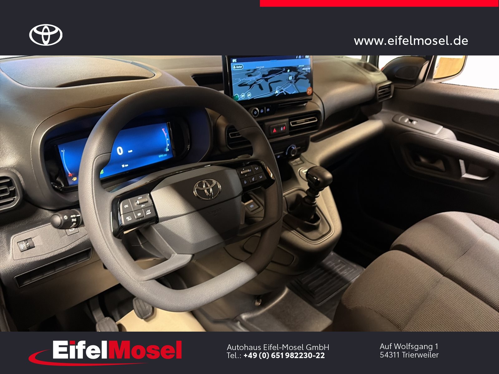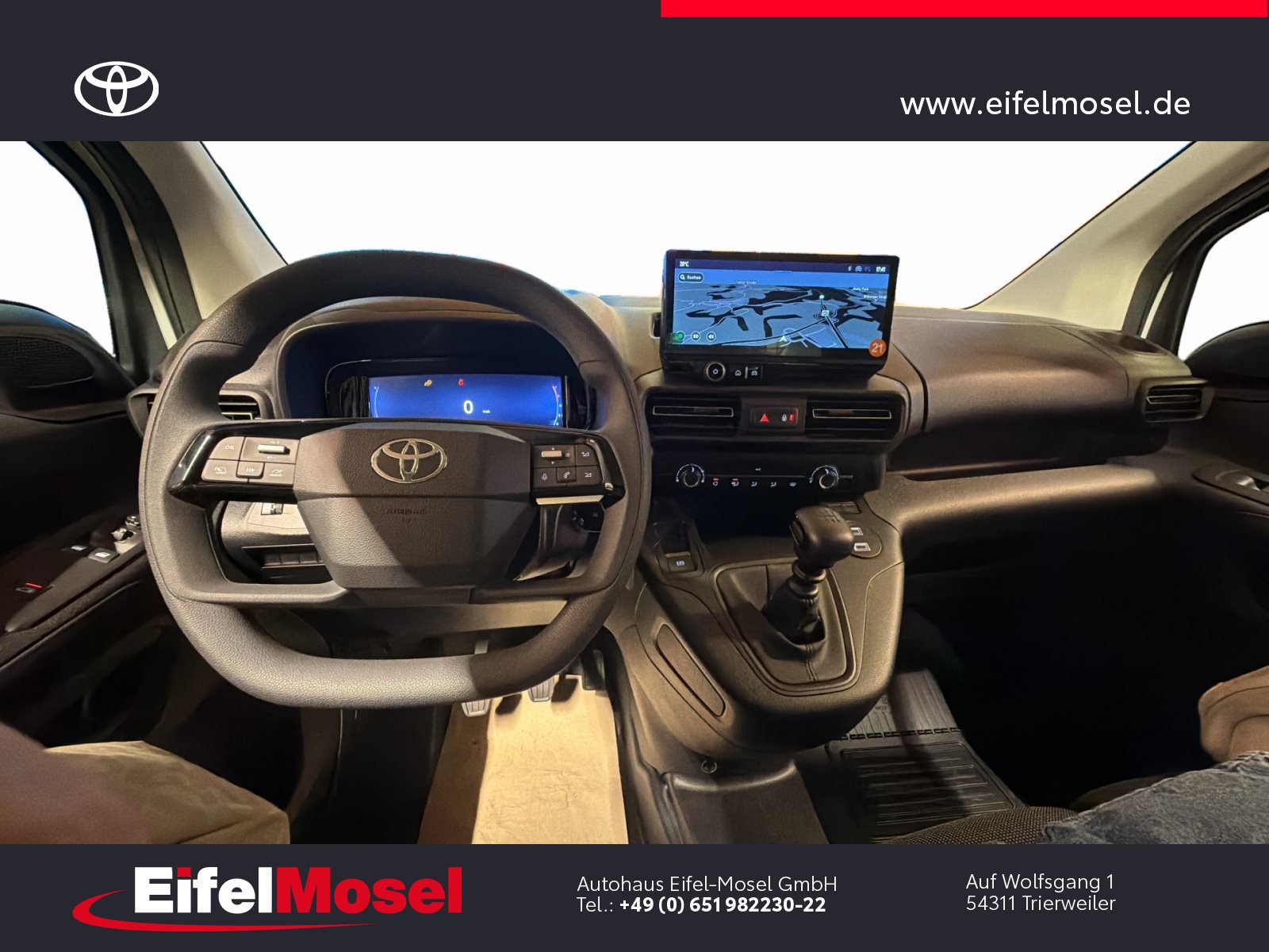 Abstandswarner, Airbag Fahrer und Beifahrer, Android Auto, Berganfahrassistent, Blendfreies Fernlicht, CarPlay, DAB Tuner, Fernlichtassistent, Geschwindigkeitsbegrenzungsanlage, Klimaanlage, LED-Scheinwerfer, LED-Tagfahrlicht, Lordose, Müdigkeitswarnsystem, Musikstreaming integriert, Navigationssystem, Notbremsassistent, Notrufsystem, Reifendruck Control / Warnung (RDC/RDW), Schiebetür rechts, Servolenkung, Sideguard, Soundsystem, Sprachsteuerung, Touchscreen, USB / Audio Interface, Zentralverriegelung, Fahrzeugnummer: 38610, , HIGHLIGHTS & PAKETE, , Comfort-Paket, , , ASSISTENZSYSTEME, , Auffahrwarnsystem (Forward Collision Warning - FCW), Geschwindigkeits-Regelanlage (Tempomat), Pre-Collision-System (PCS), Bergabfahrkontrolle (HDC / DAC), Einparkhilfe hinten, Elektr. Bremskraftverteilung, Stop&Go-System (TSGS), , , MOTOR GETRIEBE & FAHRWERK, , Anti-Blockier-System (ABS), Getriebe 6-Gang, Russpartikelfilter, Servolenkung elektrisch, Antriebsart: Frontantrieb, , , AUDIO & KOMMUNIKATION, , Audiosystem: Multimedia Toyota Pro Touch, Navigationssystem (ProTouch & Go), Smartphone-Integration x-connect (Apple CarPlay und Android Auto), DAB-Tuner (Radioempfang digital), Freisprechanlage mit Audiostummschaltung, Multimedia Display (8.0 Zoll), , , INTERIEUR, , Klimaanlage, Audiobedienung am Lenkrad, Beifahrerdoppelsitz, Fensterheber vorn elektr. mit Einklemmschutz, Komfortsitze, Lendenwirbelstütze Sitz vorn links, Seitenairbag vorn, Sitz vorn links höhenverstellbar, USB-Schnittstelle, Laderaumtrennwand, , , LICHT & SICHT, , Fernlichtassistent (Abblendautomatik Fahrlicht - AHB), Bi-LED-Scheinwerfer, Nebelscheinwerfer, Tagfahrlicht, , , RÄDER, , Reifendruck-Kontrollsystem, , , TECHNIK & SICHERHEIT, , Berganfahrkontrolle (HAC), Bremsassistent, Geschwindigkeits-Begrenzeranlage, Airbag Fahrer-/Beifahrerseite, Autonome Notbremsfunktion (AEB), Elektron. Stabilitäts-Programm mit Antriebs-Schlupfregelung (VSC mit TRC), Parkbremse elektrisch (EPB), Sicherheitssystem Toyota Connect mit automatischem Notruf (eCall), Toyota Smart Cargo, Zentralverriegelung mit Fernbedienung, , , EXTERIEUR, , Aussenspiegel elektr. verstell- und heizbar, Aussenspiegel elektr. anklappbar, Aussenspiegel schwarz lackiert, Heckflügeltüren ohne Verglasung, Schiebetür Fahrgast-/Laderaum rechts, Seitenschutzleisten, , , SONSTIGE AUSSTATTUNGEN, , Karosserie/Aufbau: Kasten, Modellpflege, Nutzlast erhöht, Schadstoffarm nach Abgasnorm Euro 6d, Steckdose (12V-Anschluss) Koffer-/Laderaum, , , TOYOTA RELAX Garantie², , Nach jeder Inspektion bis zu einem Fahrzeugalter von 15 Jahren , , ²Es gelten die Toyota Relax Garantiebedingungen der Toyota Motor Europe S.A./N.V., Avenue du Bourget 60, B-1140 Brüssel, Belgien. Die Toyota Relax Garantie gilt ausschließlich für Toyota Fahrzeuge nach jeder Inspektion bei einem Toyota Partner bis zu einem Fahrzeugalter von 15 Jahren oder einer Laufleistung von 250.000 km. Die Toyota Relax Garantielaufzeit beträgt 12 oder 24 Monate in Abhängigkeit des für das Fahrzeug vorgesehenen Inspektionsintervalls. Weitere Details sowie die Garantiebedingungen erhalten Sie unter http://www.toyota.de/relax., , , , Eingabefehler, Irrtümer und Zwischenverkauf vorbehalten, Die gemachten Angaben in Anzeigen, Internet, Preisschildern und Bildern sind unverbindliche Beschreibungen und dienen nicht als zugesicherte Eigenschaften. Der Verkäufer übernimmt keine Haftung für Tipp- und Datenübermittlungsfehler. Aufgeführte Ausstattungen sind ggfs. gesondert zu prüfen. Alle Angaben in den Inseraten sind unverbindlich und ohne Gewähr. Wir freuen uns auf Ihren Besuch. Bei Interesse wenden Sie sich bitte an Herrn Stahl oder Herrn Pauls. Tel.: 0651 - 982230-0