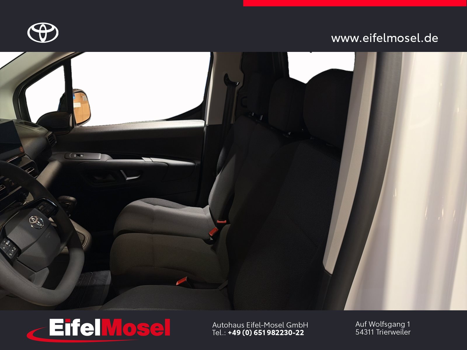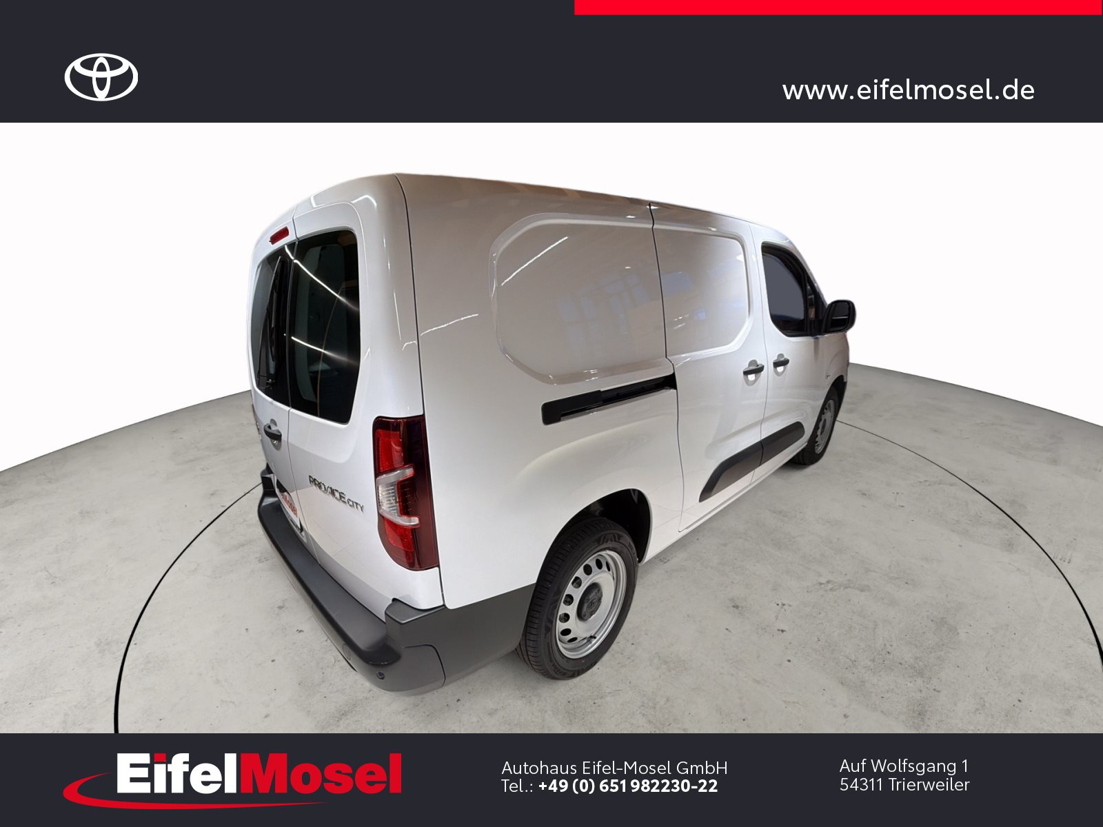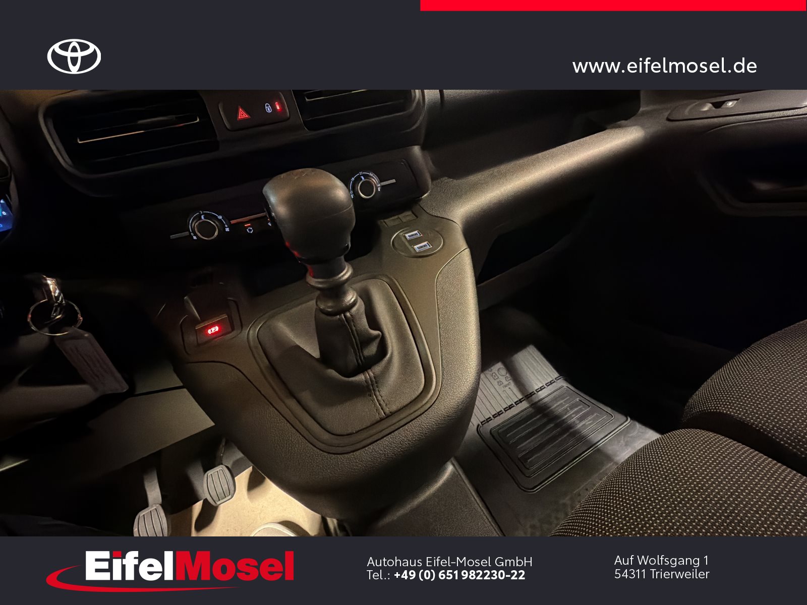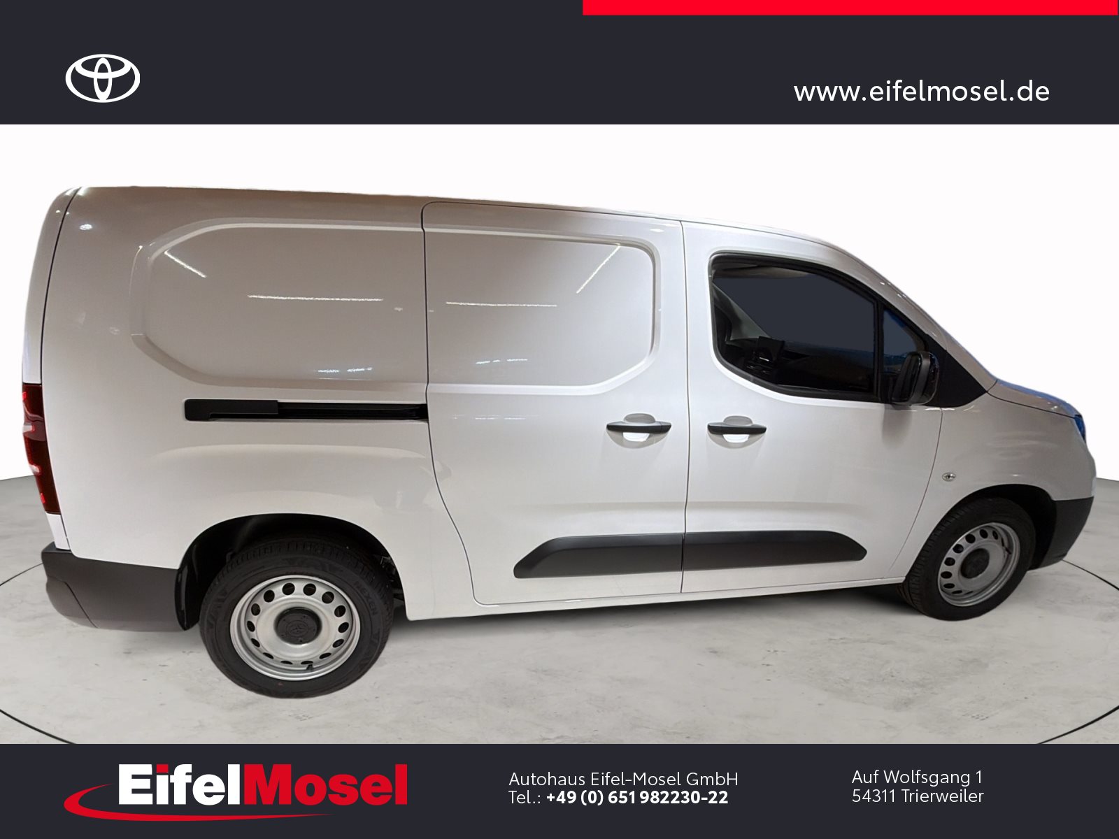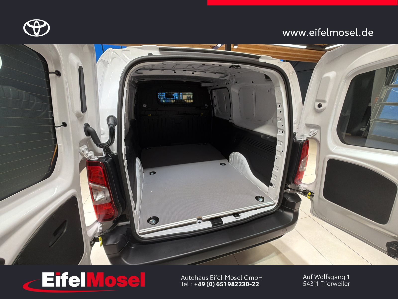 Abstandswarner, Airbag Fahrer und Beifahrer, Android Auto, Berganfahrassistent, Blendfreies Fernlicht, CarPlay, DAB Tuner, Fernlichtassistent, Geschwindigkeitsbegrenzungsanlage, Klimaanlage, LED-Scheinwerfer, LED-Tagfahrlicht, Lordose, Müdigkeitswarnsystem, Musikstreaming integriert, Navigationssystem, Notbremsassistent, Notrufsystem, Reifendruck Control / Warnung (RDC/RDW), Schiebetür rechts, Servolenkung, Sideguard, Soundsystem, Sprachsteuerung, Touchscreen, USB / Audio Interface, Zentralverriegelung, Fahrzeugnummer: 38610, , HIGHLIGHTS & PAKETE, , Comfort-Paket, , , ASSISTENZSYSTEME, , Auffahrwarnsystem (Forward Collision Warning - FCW), Geschwindigkeits-Regelanlage (Tempomat), Pre-Collision-System (PCS), Bergabfahrkontrolle (HDC / DAC), Einparkhilfe hinten, Elektr. Bremskraftverteilung, Stop&Go-System (TSGS), , , MOTOR GETRIEBE & FAHRWERK, , Anti-Blockier-System (ABS), Getriebe 6-Gang, Russpartikelfilter, Servolenkung elektrisch, Antriebsart: Frontantrieb, , , AUDIO & KOMMUNIKATION, , Audiosystem: Multimedia Toyota Pro Touch, Navigationssystem (ProTouch & Go), Smartphone-Integration x-connect (Apple CarPlay und Android Auto), DAB-Tuner (Radioempfang digital), Freisprechanlage mit Audiostummschaltung, Multimedia Display (8.0 Zoll), , , INTERIEUR, , Klimaanlage, Audiobedienung am Lenkrad, Beifahrerdoppelsitz, Fensterheber vorn elektr. mit Einklemmschutz, Komfortsitze, Lendenwirbelstütze Sitz vorn links, Seitenairbag vorn, Sitz vorn links höhenverstellbar, USB-Schnittstelle, Laderaumtrennwand, , , LICHT & SICHT, , Fernlichtassistent (Abblendautomatik Fahrlicht - AHB), Bi-LED-Scheinwerfer, Nebelscheinwerfer, Tagfahrlicht, , , RÄDER, , Reifendruck-Kontrollsystem, , , TECHNIK & SICHERHEIT, , Berganfahrkontrolle (HAC), Bremsassistent, Geschwindigkeits-Begrenzeranlage, Airbag Fahrer-/Beifahrerseite, Autonome Notbremsfunktion (AEB), Elektron. Stabilitäts-Programm mit Antriebs-Schlupfregelung (VSC mit TRC), Parkbremse elektrisch (EPB), Sicherheitssystem Toyota Connect mit automatischem Notruf (eCall), Toyota Smart Cargo, Zentralverriegelung mit Fernbedienung, , , EXTERIEUR, , Aussenspiegel elektr. verstell- und heizbar, Aussenspiegel elektr. anklappbar, Aussenspiegel schwarz lackiert, Heckflügeltüren ohne Verglasung, Schiebetür Fahrgast-/Laderaum rechts, Seitenschutzleisten, , , SONSTIGE AUSSTATTUNGEN, , Karosserie/Aufbau: Kasten, Modellpflege, Nutzlast erhöht, Schadstoffarm nach Abgasnorm Euro 6d, Steckdose (12V-Anschluss) Koffer-/Laderaum, , , TOYOTA RELAX Garantie², , Nach jeder Inspektion bis zu einem Fahrzeugalter von 15 Jahren , , ²Es gelten die Toyota Relax Garantiebedingungen der Toyota Motor Europe S.A./N.V., Avenue du Bourget 60, B-1140 Brüssel, Belgien. Die Toyota Relax Garantie gilt ausschließlich für Toyota Fahrzeuge nach jeder Inspektion bei einem Toyota Partner bis zu einem Fahrzeugalter von 15 Jahren oder einer Laufleistung von 250.000 km. Die Toyota Relax Garantielaufzeit beträgt 12 oder 24 Monate in Abhängigkeit des für das Fahrzeug vorgesehenen Inspektionsintervalls. Weitere Details sowie die Garantiebedingungen erhalten Sie unter http://www.toyota.de/relax., , , , Eingabefehler, Irrtümer und Zwischenverkauf vorbehalten, Die gemachten Angaben in Anzeigen, Internet, Preisschildern und Bildern sind unverbindliche Beschreibungen und dienen nicht als zugesicherte Eigenschaften. Der Verkäufer übernimmt keine Haftung für Tipp- und Datenübermittlungsfehler. Aufgeführte Ausstattungen sind ggfs. gesondert zu prüfen. Alle Angaben in den Inseraten sind unverbindlich und ohne Gewähr. Wir freuen uns auf Ihren Besuch. Bei Interesse wenden Sie sich bitte an Herrn Stahl oder Herrn Pauls. Tel.: 0651 - 982230-0